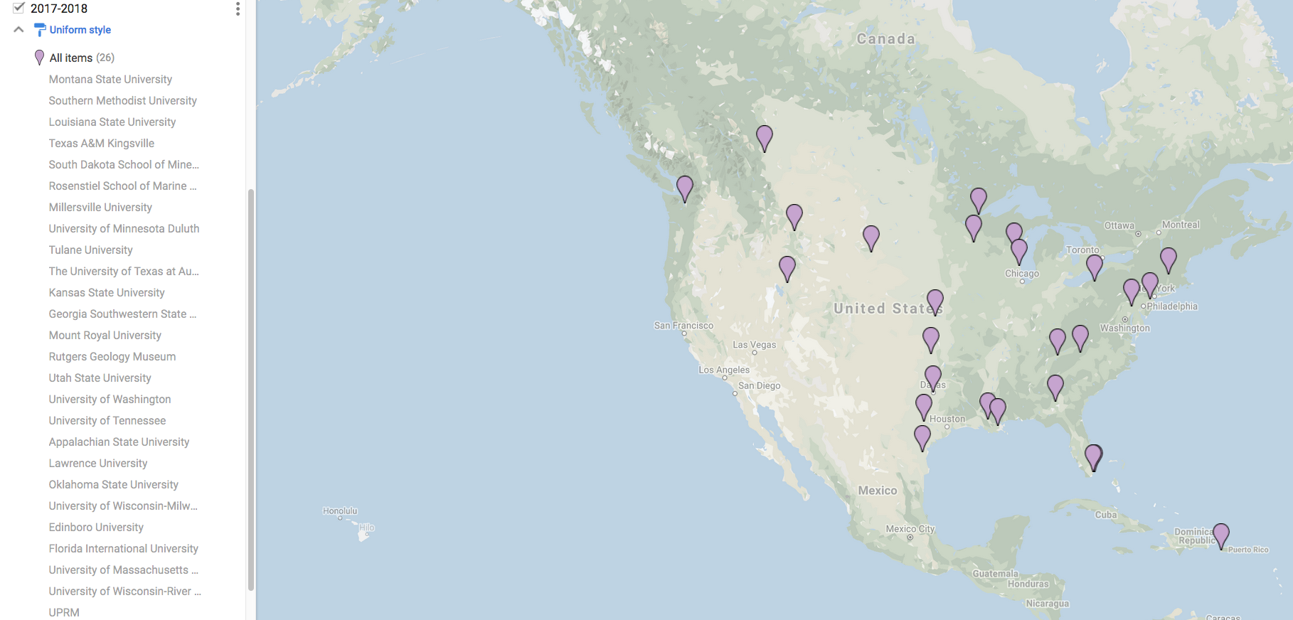 EarthScope Speaker Series Location over time. Between 2008 and 2019, 55 speakers presented EarthScope related research in 210 institutions.